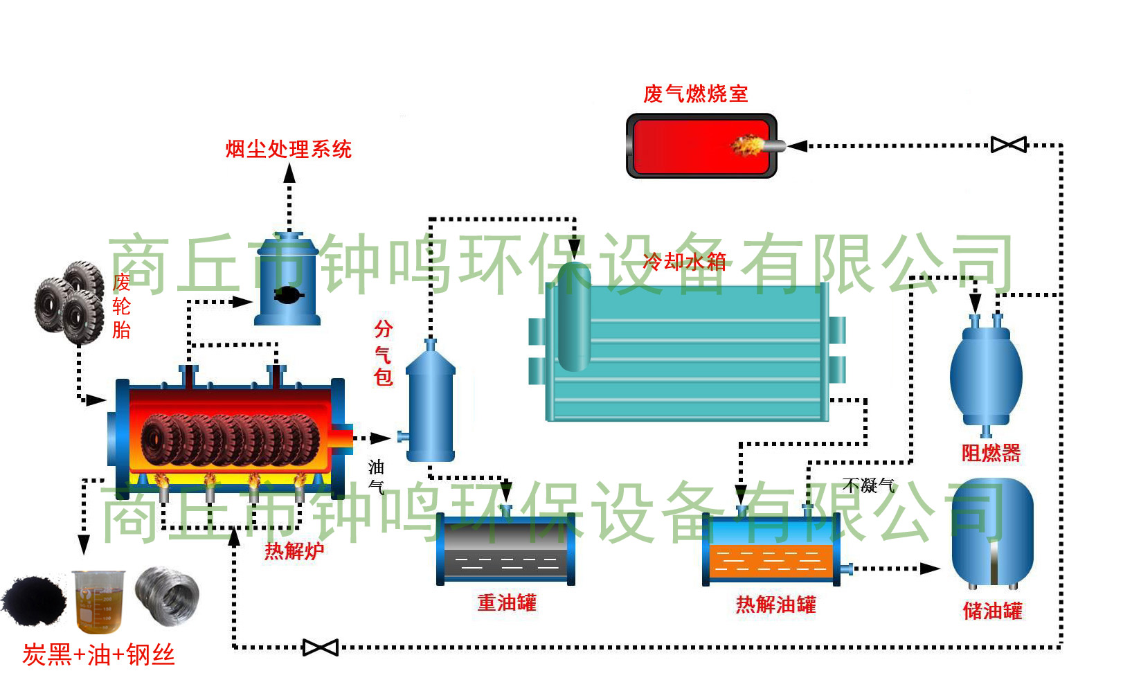 為了解決廢舊輪胎,本廠生產(chǎn)的輪胎裂解設(shè)備確保無三廢排放。設(shè)備有尾氣燃燒再利用裝置,確保無味。以燃料裂解油為例(也可以用天然氣),設(shè)備配有除塵器,煙塵排放達(dá)標(biāo),整個循環(huán)冷卻系統(tǒng)水循環(huán)且無污染,絕無廢水排放;廢渣因經(jīng)過500多度的高溫處理,無任何的毒性碳黑,且炭黑可以精煉,應(yīng)用范圍很廣,不凝氣是廢輪胎熱解的能量來源,油品和熱解炭黑為廢輪胎熱解的主要產(chǎn)品,而從產(chǎn)品的品質(zhì)和價值講,裂解設(shè)備很好的解決了垃圾污染問題,不會造次二次污染。在解決問題的同時也創(chuàng)造了巨大的經(jīng)濟(jì)效益。